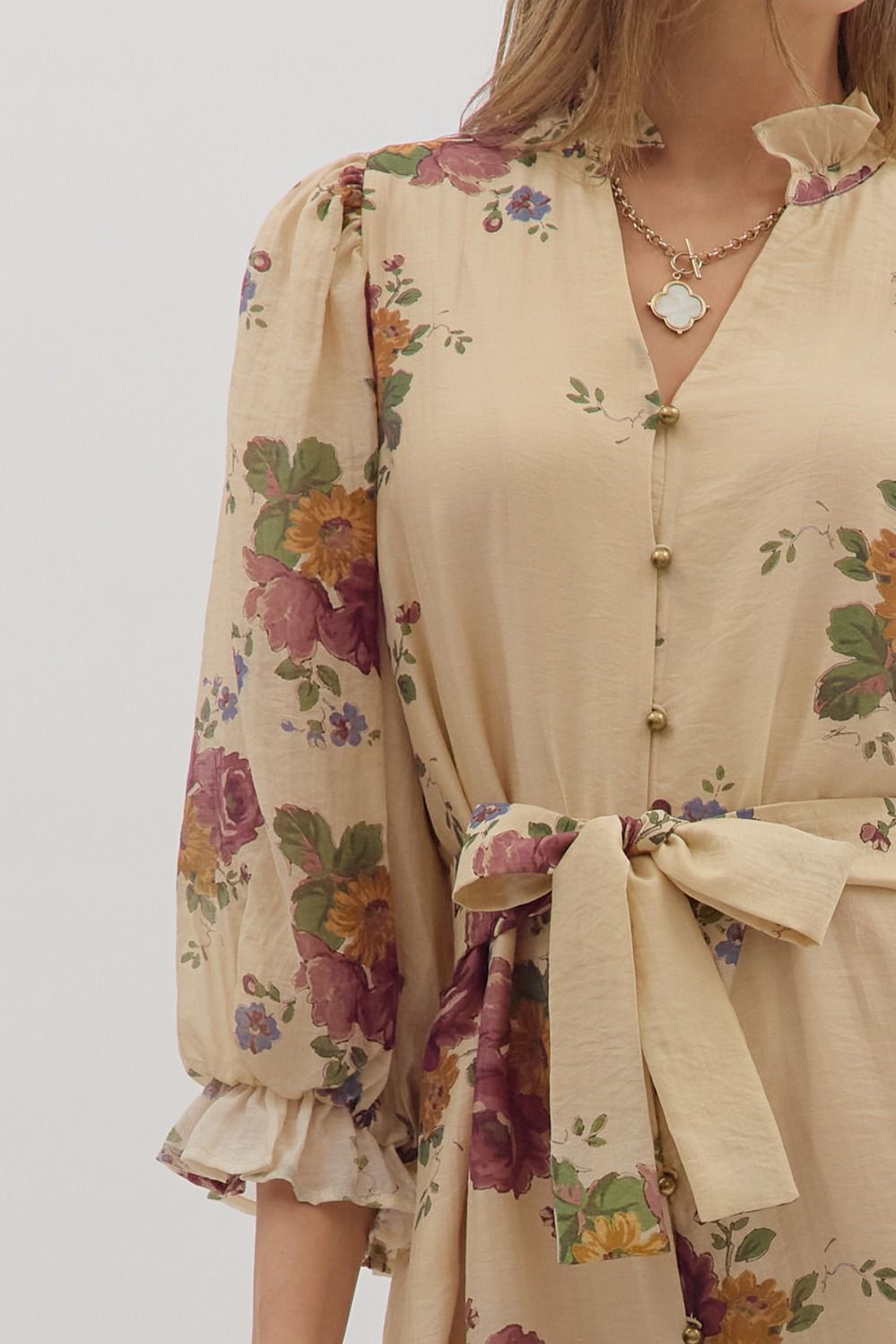 Romantic and effortlessly chic, the Floral Ruffle Neck Mini Dress W/Tie Waist brings soft florals and vintage-inspired details to your wardrobe. Designed with a ruffled neckline, V-neck front, and puffed 3/4 sleeves, this lightweight woven dress features a functional front button closure and a detachable waist tie for a flattering silhouette. Fully lined and non-sheer for comfortable wear from day to night.