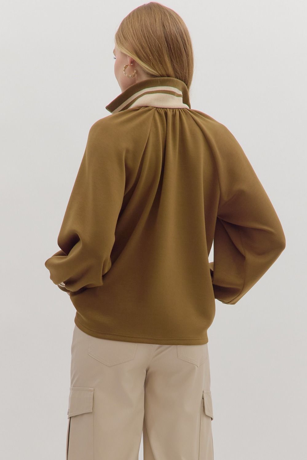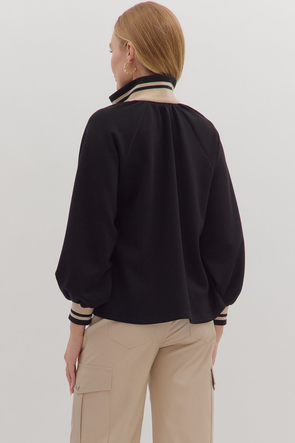 Elevate your casual style with the Half Zip Knit Top W/Striped Rib Trim. This solid long sleeve top features a sleek half-zip closure, sporty striped ribbed collar and cuffs, and a relaxed silhouette for easy wear. Crafted from a medium-weight knit that's soft, stretchy, and non-sheer, it’s perfect for layering or wearing solo on cooler days. True to size.