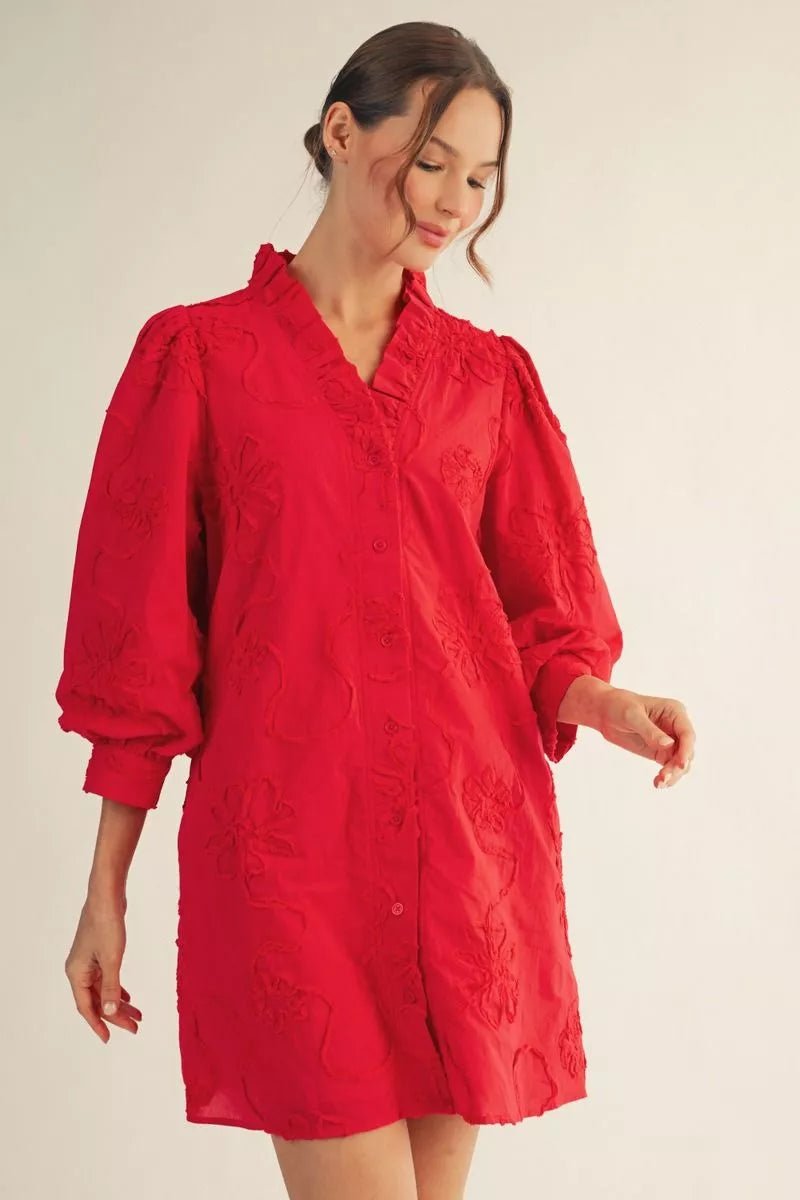 Feminine and fresh, this 3D Floral Textured Puff Sleeve Dress features delicate details that elevate everyday style. Designed with a ruffled neckline and intricate tonal floral texture, this mini dress includes functional side pockets and a button-down front for effortless wear. The 3/4 puff sleeves add volume and charm, perfect for both casual and dressed-up occasions.