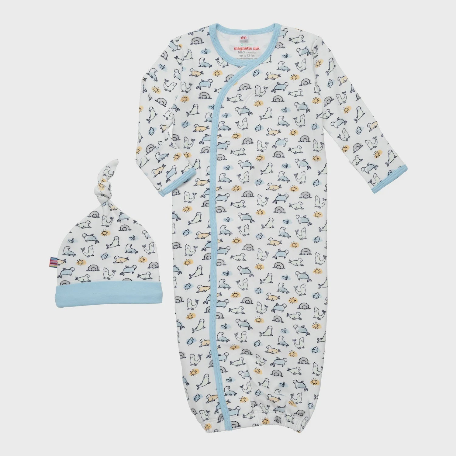 The cozy sleeper gown + hat set is a wardrobe staple for newborns who require constant diaper changes (aka all of them). with magnets down the front, baby stays in the gown during the diaper switcheroo: separate magnets, put on a freshy, click magnets, done. other amazing features: eco-friendly organic cotton and built-in mitten cuffs.